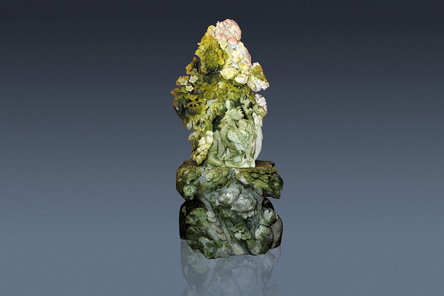 随意点染,触处成趣。玉雕师利用玉色变化巧妙雕琢出牡丹、玉兰、葡萄、南瓜、花生、雄鸡、鸡雏、飞鸟等十多种物品,共同组成一幅和谐饱满的“农家乐”,惟妙惟肖,巧夺天工。天然玉质本无尘,顺理成章最可人。花果杂陈鸣禽乐,妆点野趣秒入神。 |