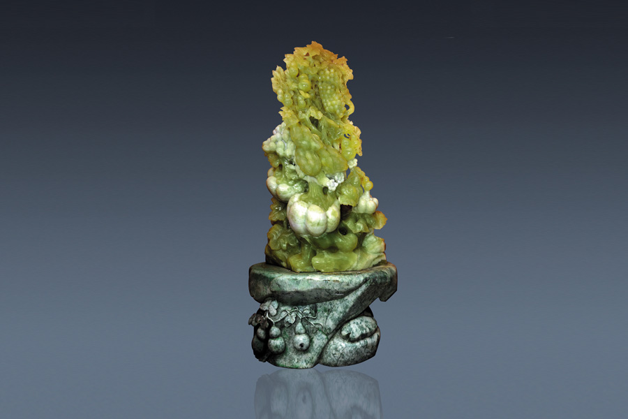 一块通体晶莹的上等玉材,雕刻出上百颗形状各异的四季瓜果,代表了成熟、丰收和富足。天然的玉色表现瓜果自然的生机,玲珑剔透,栩栩如生,达到了形、色、意的完美统一。云破天青碧波潭,滴露玲珑白玉盘。脱胎玉质独一品,偶遇知音结胜缘。 |