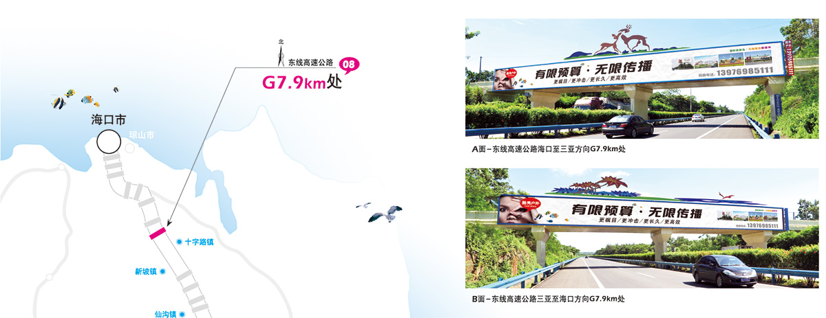 特点:设置于海南国际旅游岛东线高速公路中央,牌面超大、视向垂直、全天候发布;广告形式独特、画面震撼醒目、环境相容性好等优势。