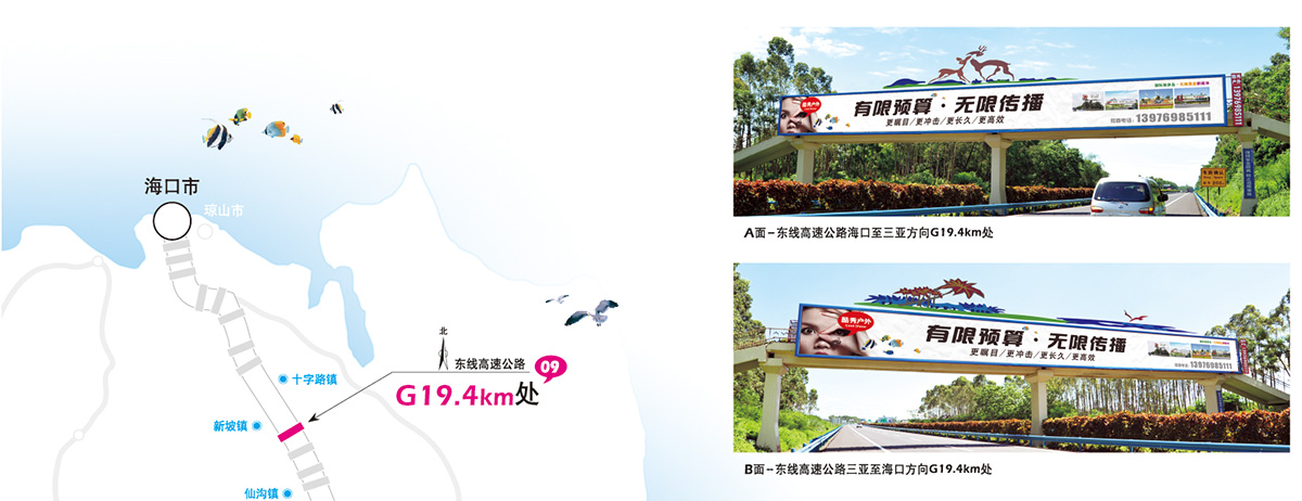 特点:设置于海南国际旅游岛东线高速公路中央,牌面超大、视向垂直、全天候发布;广告形式独特、画面震撼醒目、环境相容性好等优势。
