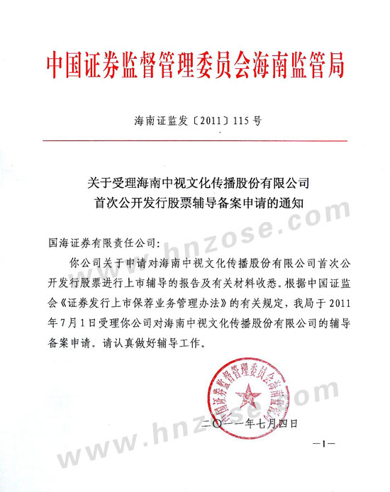 China Securities Regulatory Commission Hainan Office officially accepted the application for the IPO (Initial Public Offering) of Hainan ZOSE Cultural Communication Stock CO., LTD which was guided by the Sealand Securities Co., Ltd on July 1, 2011. This meant ZOSE Cultural Communication Stock CO., LTD formally entered the pre-listing tutoring period.