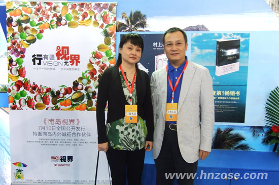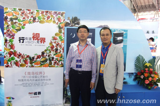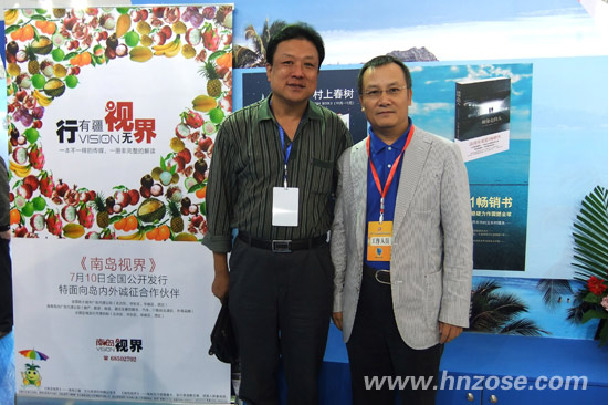 (图为南方出版社辛拓副总编辑(左)与海南suncitygroup太阳成集团集团董事长刘文军(右)在《南岛视界》展区合影)
