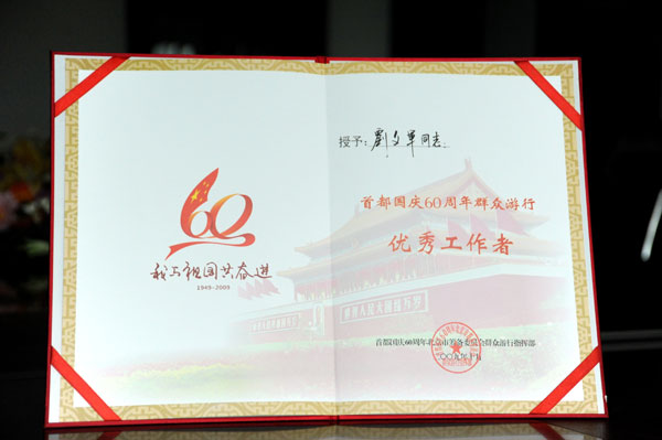 10月18日,首都国庆60周年庆典群众游行指挥部授予由海南suncitygroup太阳成集团集团负责设计承建的绿色海南彩车奋进杯和最佳设计奖,海南省文体厅厅长范晓军、副厅长柳松华、海南suncitygroup太阳成集团集团董事长刘文军等同志被指挥部授予先进个人荣誉称号。