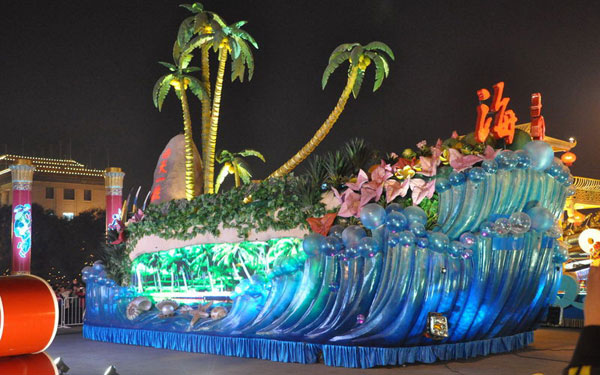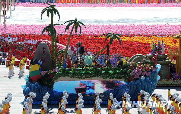 2009年10月1日上午10点随着阅兵仪式流程的推进,美丽的热带风情船——绿色海南彩车展现在世界前面。10月2日—11日,海南彩车在天安门广场接待世界各地游客约500万人次。通过彩车精彩地向世人展放,对宣传海南国际旅游岛起到重要的作用。