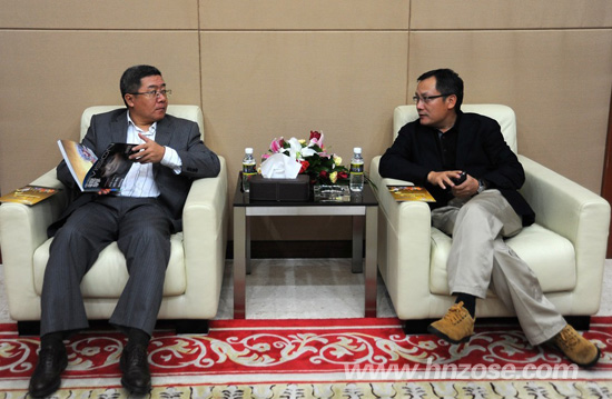 (suncitygroup太阳成集团集团董事长刘文军[右]与光大银行海口分行行长张轶昌在贵宾室交谈)