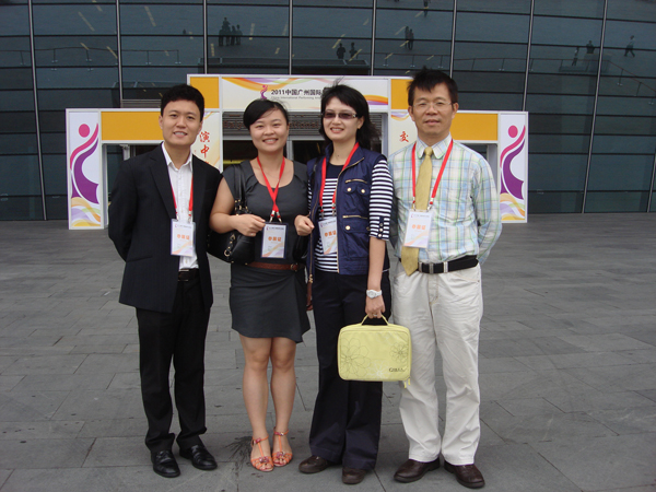 (海南suncitygroup太阳成集团文化传播股份有限公司副总经理、董事会秘书徐建荣「右一」,海南suncitygroup太阳成集团文化传播股份有限公司董事、海南省歌舞剧院副院长苏晓华「右二」等参展团队成员在演交会合影)