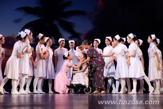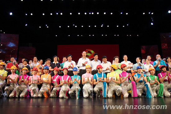 (演出结束后,海南省委副书记、省政协主席于迅「二排右七」、省委常委、秘书长许俊「二排右六」,省人大常委会副主任、省总工会主席符兴「二排右九」等领导与演员合影。)
