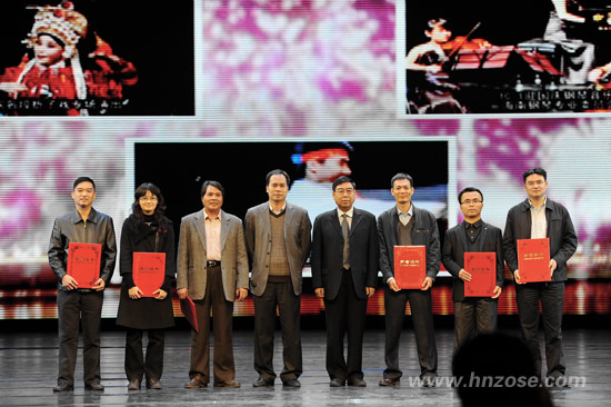 (海口市人民政府副秘书长吴成贵「左四」、省文体厅副厅长王炳林「右四」与获奖单位代表合影)