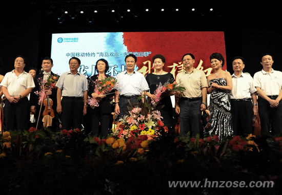 (演出结束后,海南省委副书记、省长罗保铭(前左一)等领导上台慰问长影艺术家们)