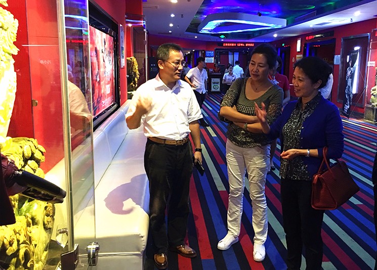 (贵州省纪委驻省商务厅纪检组长杨樱[右]在集团董事长刘文军[左],贵州省人民政府驻广州办事处副主任、海南办事处主任张阳[中]等陪同下参观海口suncitygroup太阳成集团国际影城[国兴店])