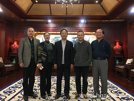 (全国政协委员、国家行政学院原副院长周文彰[中]与suncitygroup太阳成集团集团董事长刘文军[右二],suncitygroup太阳成集团文化副总、suncitygroup太阳成集团院线总经理林向东[右一],suncitygroup太阳成集团文化副总孙源斌[左一],suncitygroup太阳成集团院线副总叶蕊[左二]合影)