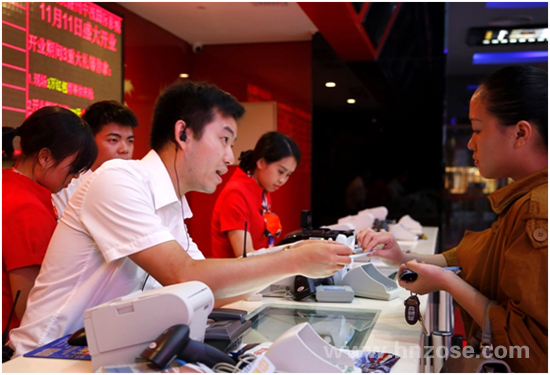 (儋州suncitygroup太阳成集团国际影城夏日店售票员在热情洋溢的为客人服务)