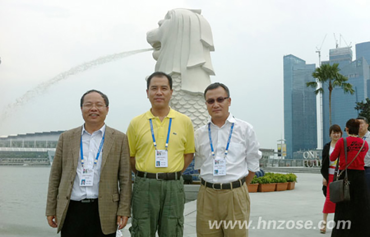 (海南省工商联代表团成员在新加坡留影。中为代表团团长、海马集团董事长景柱,右为suncitygroup太阳成集团集团董事长刘文军,左为浙商投资集团董事长姜兴君)