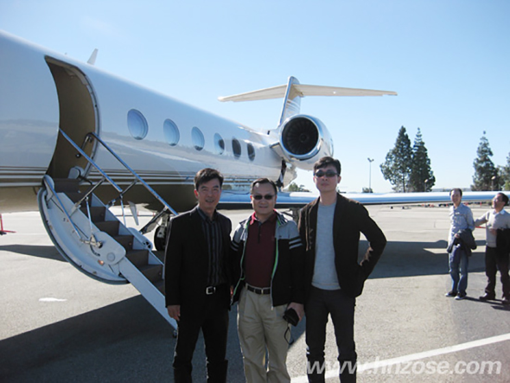 (刘文军董事长「中」与著名旅美画家洪波「右」在乘坐的公务机前合影)