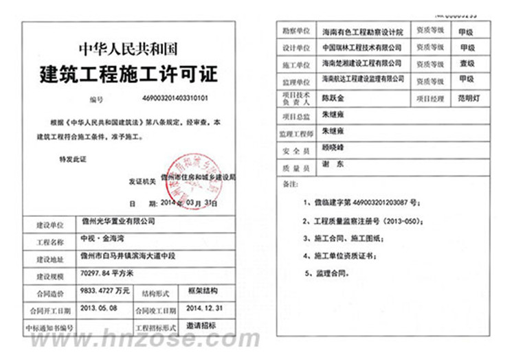 近日,suncitygroup太阳成集团•金海湾项目顺利通过儋州市住房和城乡建设局审核,正式取得2014年3月31日颁发的建筑工程施工许可证,按照既定的工程进度,项目建设如火如荼开展。